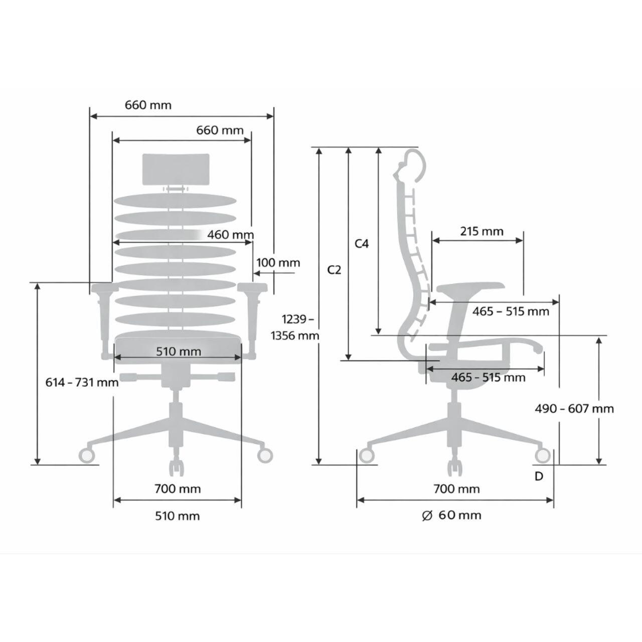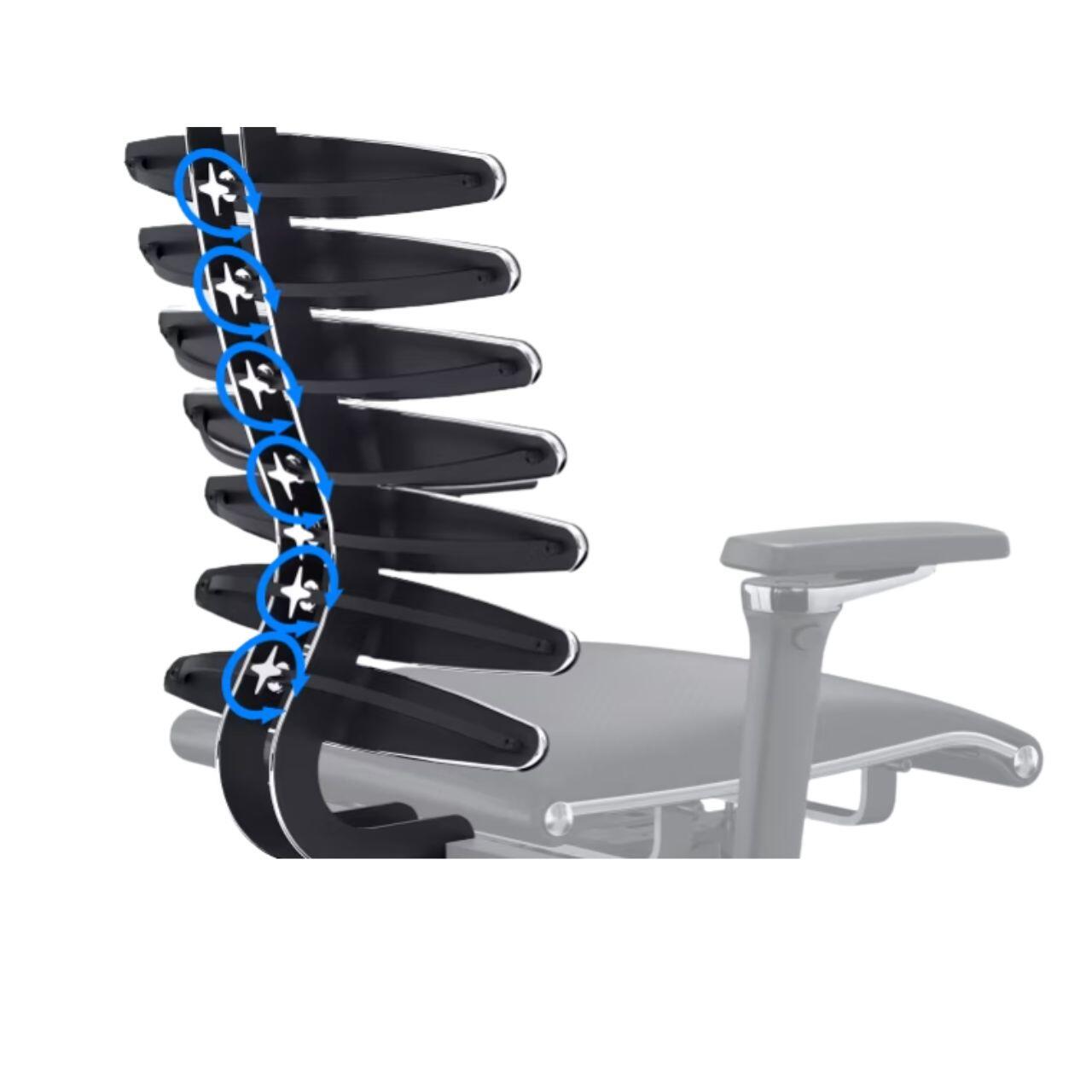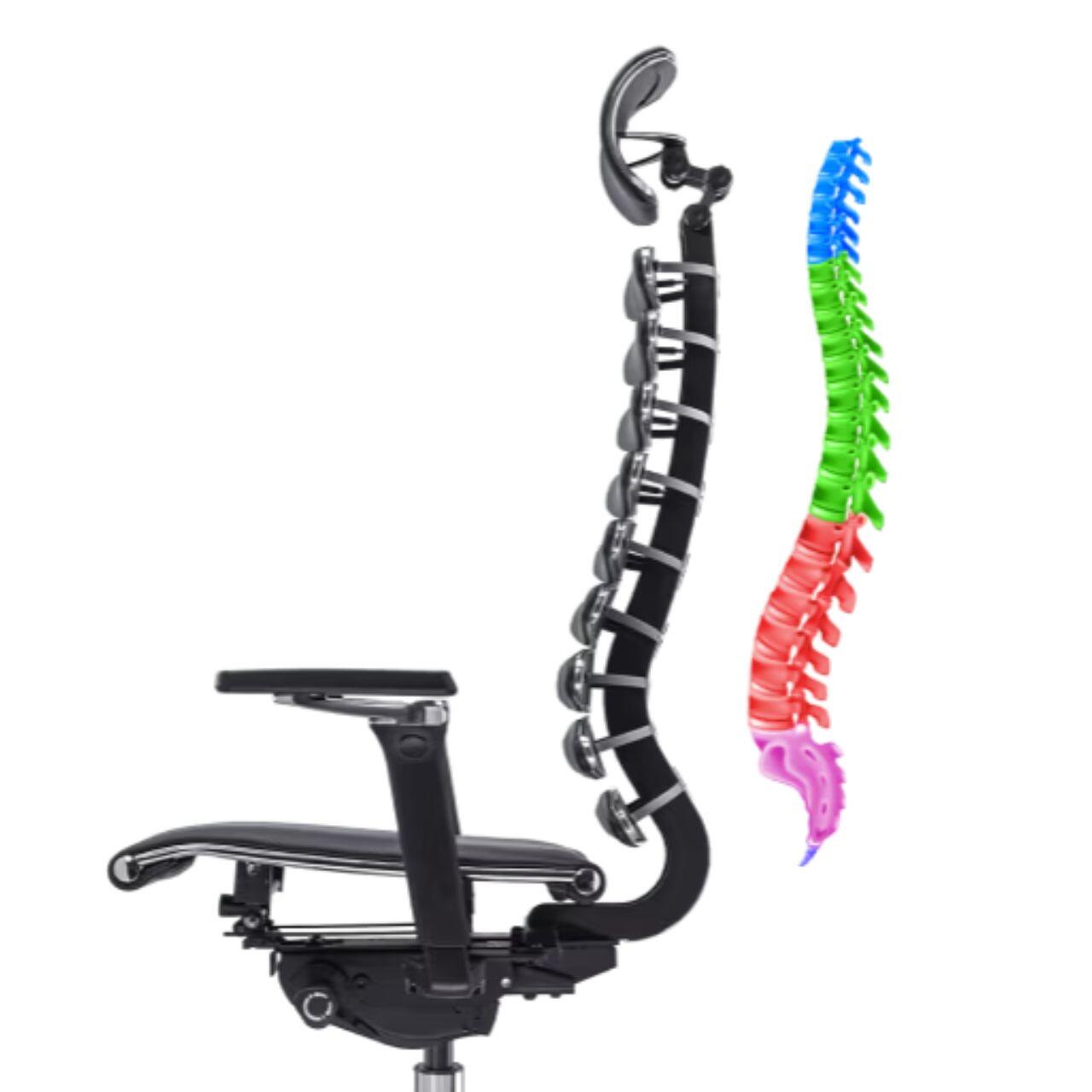 Design inovator și funcționalitate remarcabilă: Acest scaun este dotat cu un spătar ce se remarcă printr-o structură unică, formată din linii elastice care oferă un suport activ și flexibil al coloanei vertebrale. Spătarul se adaptează la mișcările corpului, oferind susținere lombară constantă, și ajută la menținerea unei posturi corecte pe toată durata utilizării. Designul său modular permite reglarea individuală a tensiunii fiecărui element al spătarului, ceea ce înseamnă că se poate personaliza în funcție de nevoile fiecărei persoane.