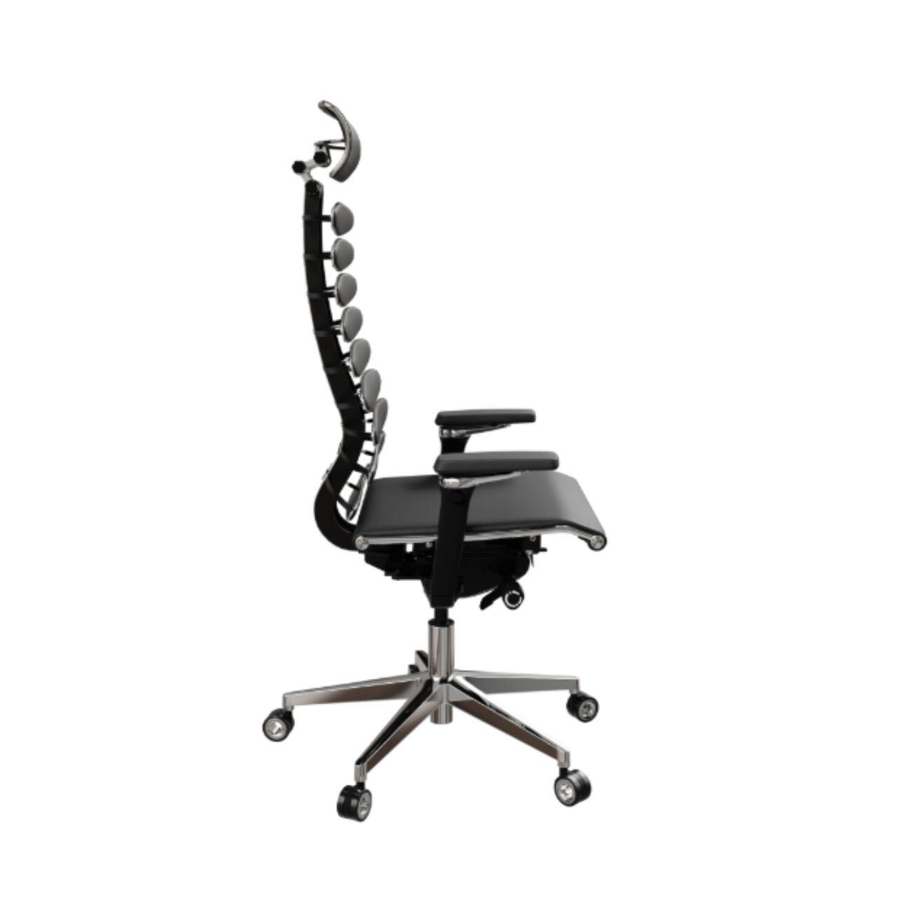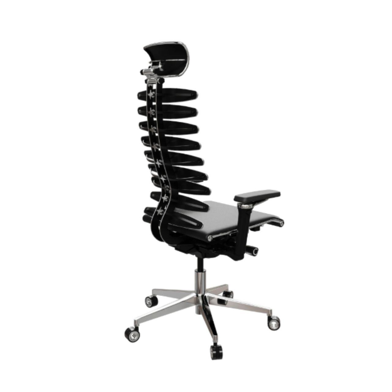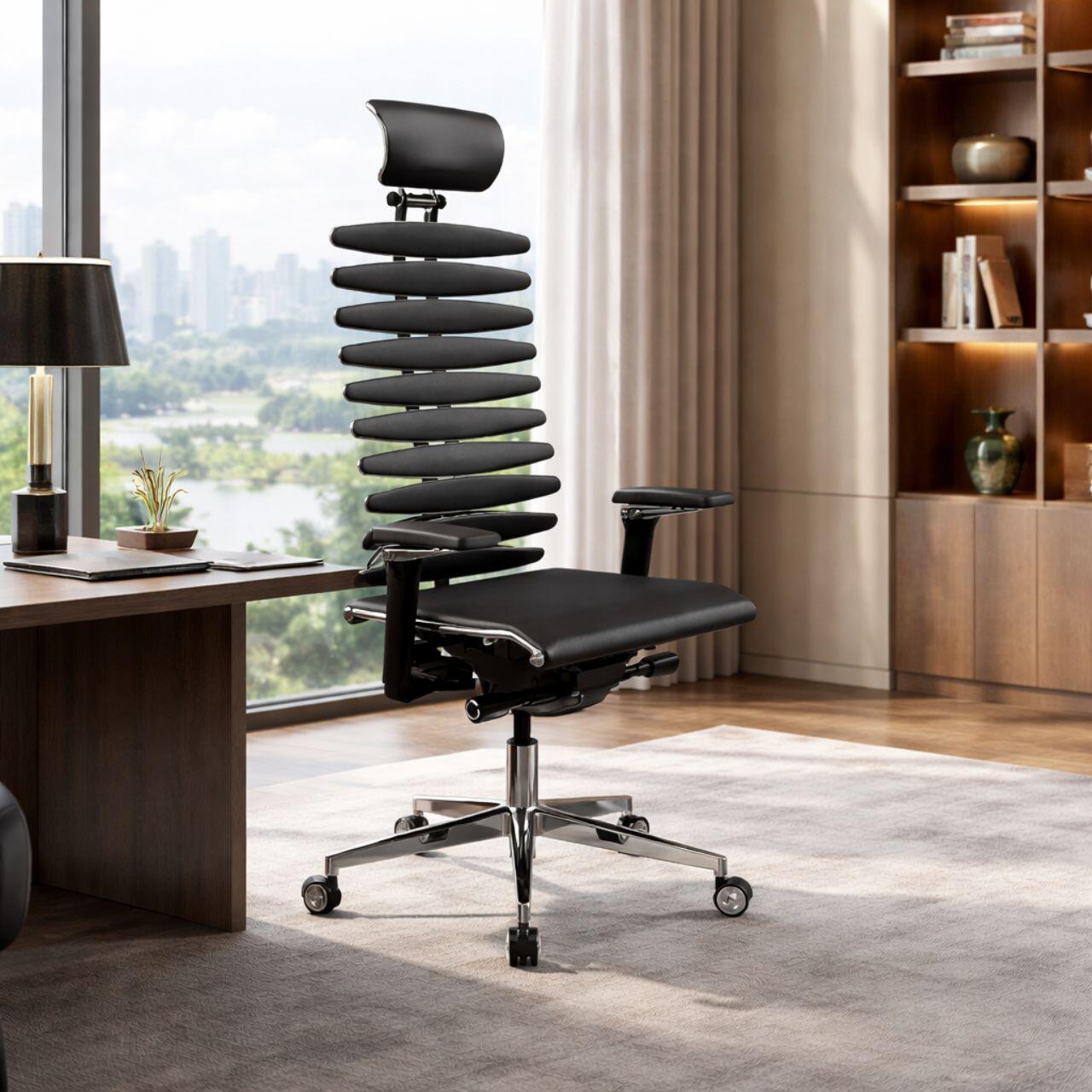 Design inovator și funcționalitate remarcabilă: Acest scaun este dotat cu un spătar ce se remarcă printr-o structură unică, formată din linii elastice care oferă un suport activ și flexibil al coloanei vertebrale. Spătarul se adaptează la mișcările corpului, oferind susținere lombară constantă, și ajută la menținerea unei posturi corecte pe toată durata utilizării. Designul său modular permite reglarea individuală a tensiunii fiecărui element al spătarului, ceea ce înseamnă că se poate personaliza în funcție de nevoile fiecărei persoane.
